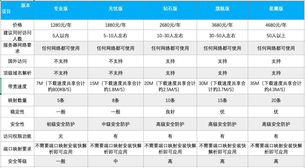 快解析可以帮助您实现从外网访问内网的应用,他是一个按年收费的产品,考虑到网络环境、安全性、稳定性等要素,目前客户大部分采用的是专业版、无忧版、钻石版、旗舰版、星耀版,小部分客户采用家庭版、精英版、NAS专版,家庭版和精英版对您的网络环境有要求,需要端口映射,安全性相对较低不建议采购,NAS专版是针对NAS设备使用的版本,如果您是电脑上安装使用是不支持的。下面简单介绍一下各个版本的区别,您可以根据自己的实际需求选择对应版本,下面已经标注了年费的具体价格。