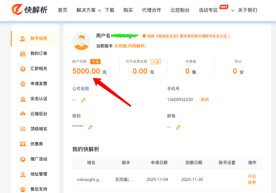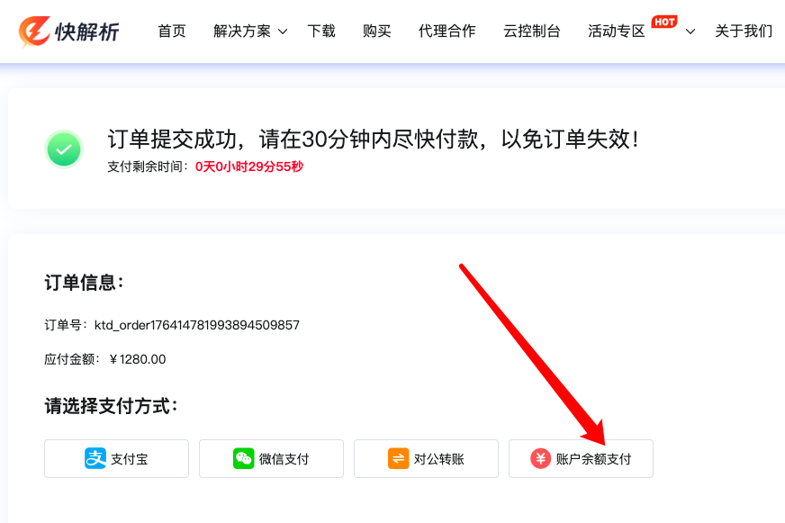 当然您也可以对公转账付款,只是这种方式需要人工处理,您在转账的时候备注清楚您的快解析用户名,商务人员查询到账信息后会给您备注的快解析账号充值,这种方式可能相对较慢,一般您打款充值后24小时内处理,充值后您查看快解析官网 —— 个人中心模块,余额即可显示您的充值汇款额度。有余额后您在下单,支付网方式采用余额支付即可。快解析对公充值帐户查看请点击:https://www.kuaijiexi.com/analysis/#/huiKuan
