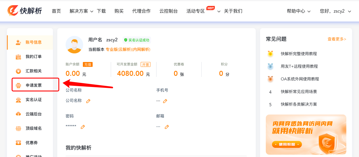 可以的,您在快解析官网下单购买快解析后,用您的快解析用户名登录快解析官网个人中心模块,然后可以点击“申请发票”