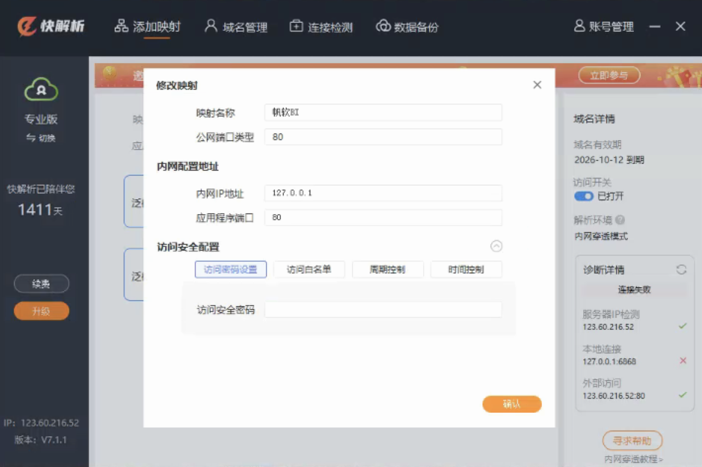 添加成功后快解析就为您提供了一个访问地址,这个地址是外网访问帆软BI系统的地址