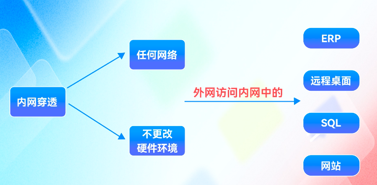 内网穿透就是在任何网络环境、不更改网络设备的前提下,实现外网用户访问内网中的应用,包括 :ERP、远程桌面、SQL、网站等等