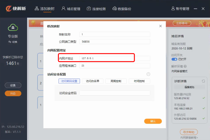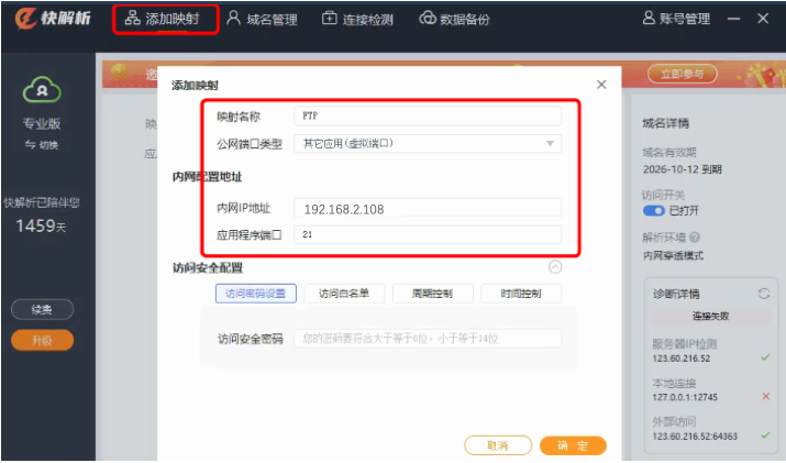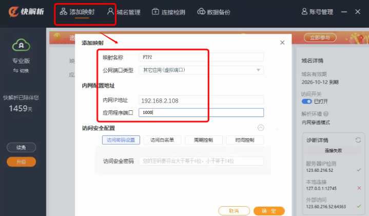 登录快解析客户端后,点击“添加映射”模块,在弹出来的对话框中填写映射信息