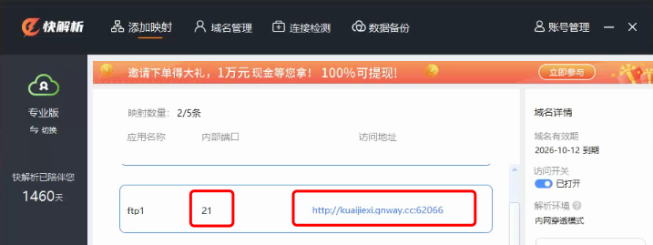 填写完以上信息后,点击确定,端口添加完成,请记住这个21端口生成的地址,这个地址是日后外网人员访问FTP系统的地址