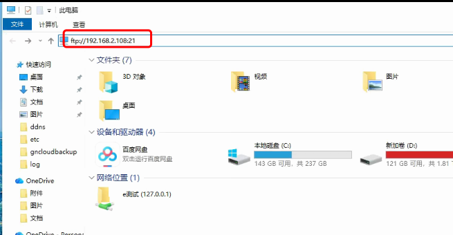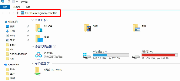 在外网客户端,打开“我的电脑” 输入框中输入 2.3环节中,映射21端口生成的地址进行访问,这里要注意访问的前缀是ftp,地址是映射21端口对应的地址,不要写错了。