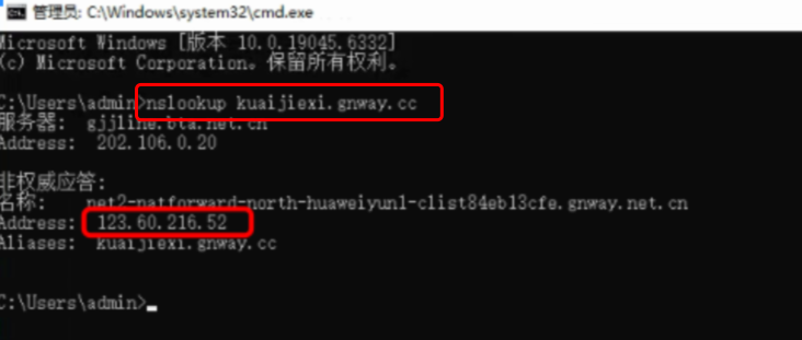 在弹出来的黑色命令行中,输入: nslookup ***.gnway.cc ; 这个***就是您的快解析账号,例如:您的快解析账号是kuaijiexi ,那输入的地址就是 nslookup kuaijiexi.gnway.cc 输入完毕后点击回车,即可查看到解析服务器地址