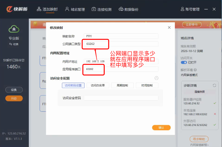 A、“数据通道端口范围”填写2.4环节中,快解析生成的地址后面的端口,例如上面映射1000生成的端口是63262,这里就写成