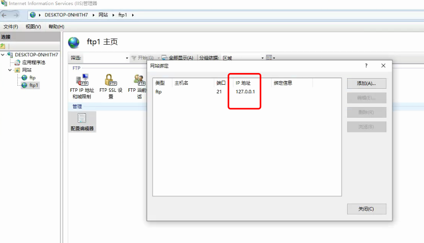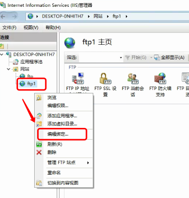 打开您的FTP站点管理器,新建一个FTP站点,这个新建的FTP站点与您在用的FTP站点配置一样,包含:端口、文件夹路径、访问权限等,都一样。如下图所示:ftp1为新建的站点,ftp为用户原来的站点,创建完成后在新的ftp站点上右击鼠标选择“编辑绑定”
