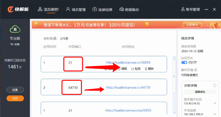 做完以上的操作后,内网就可以用原来的内网IP访问了,同时外网还可以通过快解析的地址访问