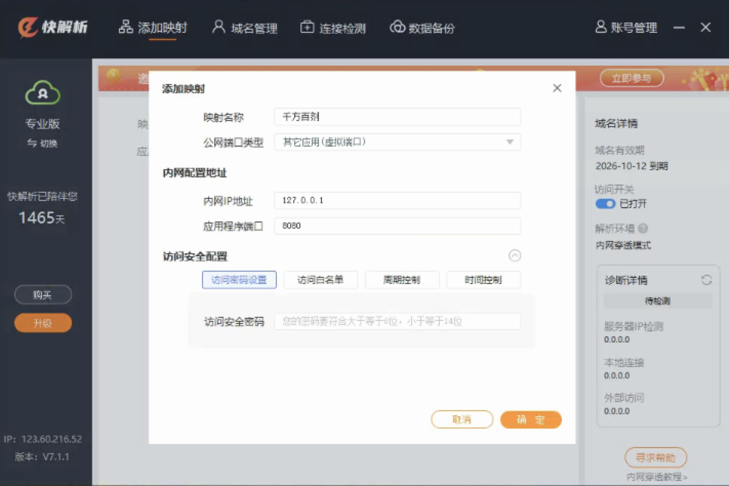 添加成功后快解析就为您提供了一个访问地址,这个地址是外网访问管家婆千方百剂系统的地址