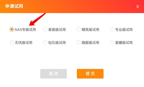 在弹出的对话框中,选择【NAS专版试用】,然后点击提交,该账号就变成了快解析NAS专版账号