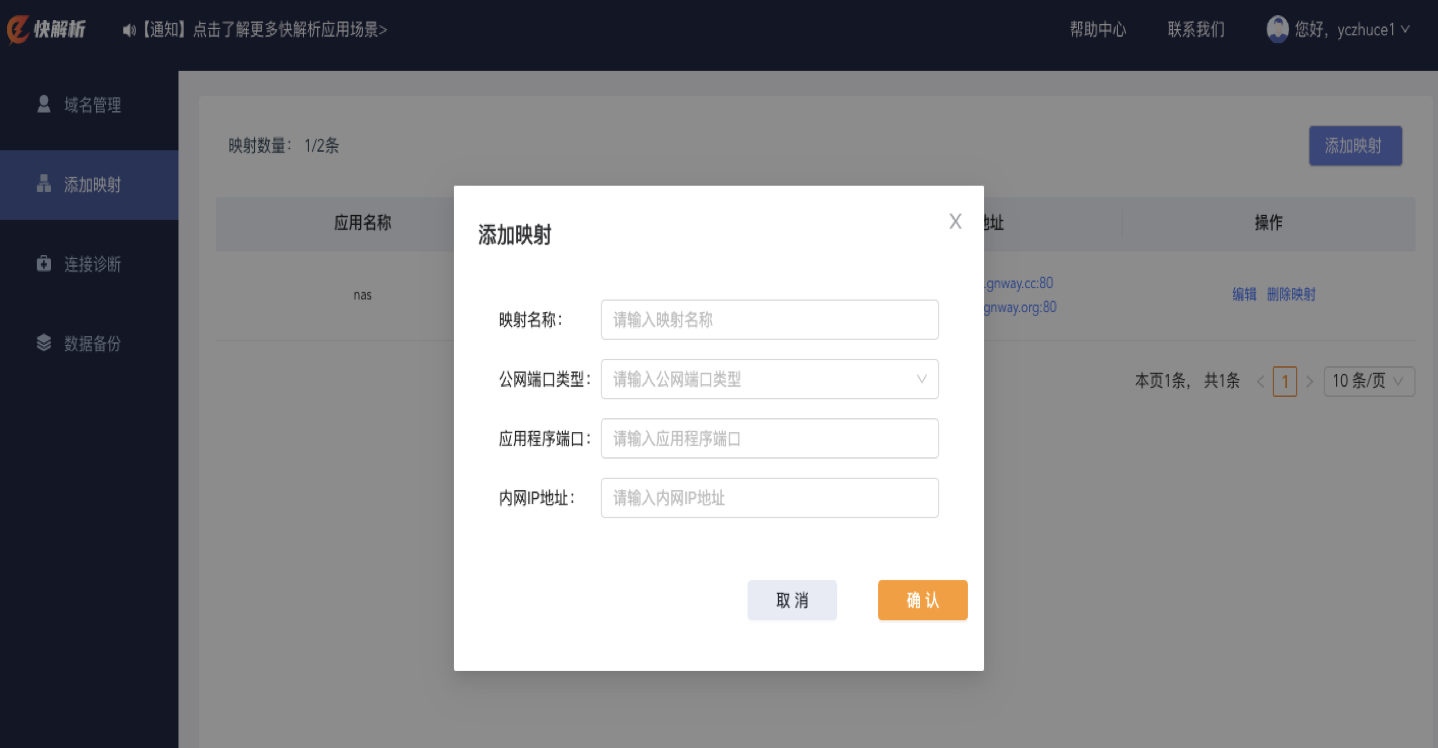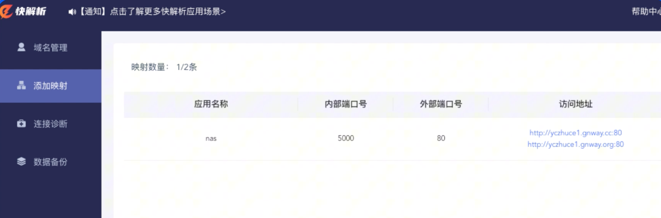 点击确认后,该映射信息将会自动同步到快解析客户端程序,这样就实现了远程配置快解析端口,无需操作快解析客户端,简单、方便、快速