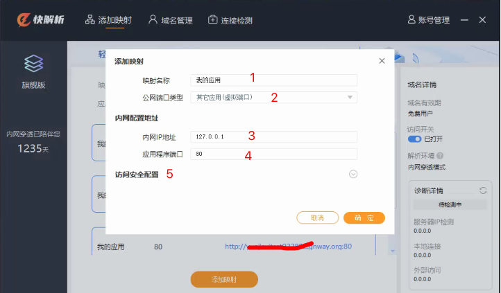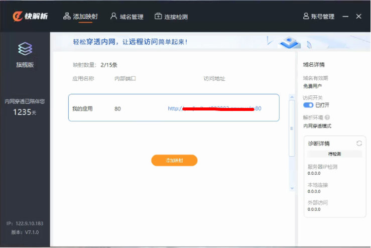 接下来系统自动跳转到内网穿透快解析客户端的【添加映射】页面,内网穿透快解析会为您提供一个域名地址,这个域名地址一般都是您注册的账号名称+gnway.cc ,这个地址就是您在注册环节填写的服务器地址和端口,快解析会为您提供一个对外访问地址,通过这个地址就可以实现外网访问内网的应用了