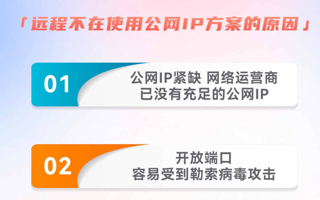 远程不在使用公网IP方案的原因,一是:公网IP资源紧缺,网络运营商已经没有充足的公网IP;二是:通过公网IP访问,需要在服务器开放相应端口,开放端口后容易受到勒索病毒攻击