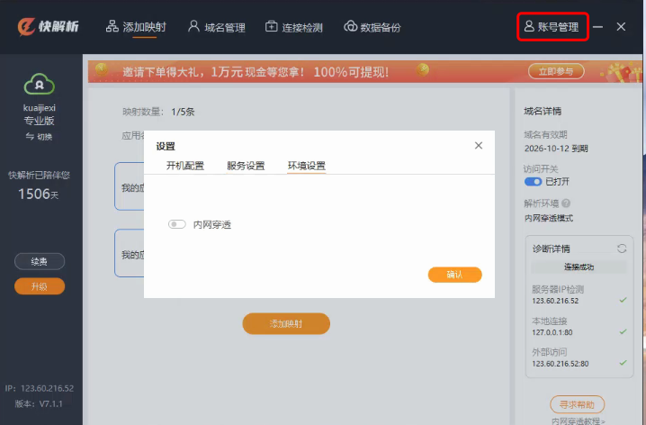 打开快解析软件客户端,点击右上角【账号管理】- 【设置】-【环境设置】,将内网穿透蓝色的按钮取消即可。