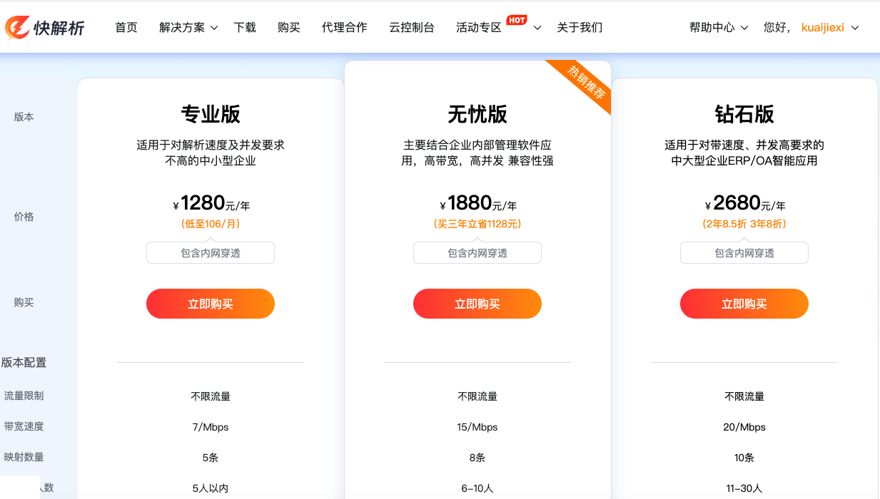 快解析有很多版本,家庭版和精英版是公网版本,对于您这种环境是不可以使用的,您可以采用快解析的专业版、无忧版、钻石版、旗舰版、星耀版,这两个版本是含有内网穿透功能的版本,没有公网IP也可以实现您家庭网络里的服务器应用外网访问。