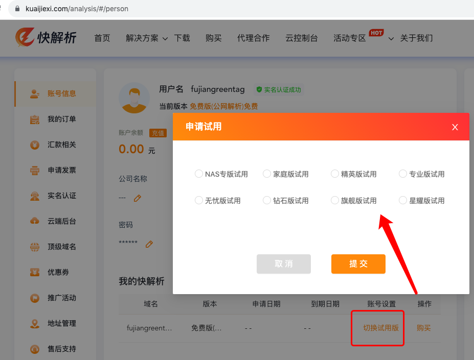 使用快解析默认的试用时长为15天,比如您在试用快解析A版本,您觉得A版本无法满足您的应用需求,您可以尝试试用其他版本,您可以登录快解析官网 ,输入您的快解析用户名和密码,进入个人中心模块,找到您的快解析账号,然后点击“切换试用版”即可